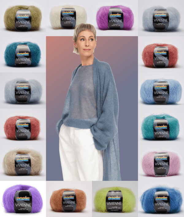 Vivienne by Sesia combines the soft halo of super kid mohair with the vibrant shine of silk in one incredible yarn that is loved by knitters all over the world. Available in a kaleidoscopic array of stunning colours, you can use it to create different effects and styles.